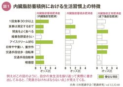 ある興味深いデータがあります。日本肥満学会が実施した調査「内臓脂肪蓄積例における生活習慣上の特徴」では、メタボリックシンドロームの方々の行動パターンが浮き彫りとなっています(図1)。「アイスクリームなどの甘いものが好き」で、「緑黄色野菜が嫌い」。しかも1回の食事の時間が30分以上ということから、「満腹になるまで食べ続けてしまう」ことも窺えます。体重こそどんどん増えますが、痛くも何ともない。しかしその裏側では、高血圧に拍車がかかり、血中のコレステロールが異常になる。リスクが高まっているということを意識できなければ、生活習慣病の減少はなかなか厳しいと思います。