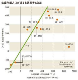 図版は戦後の生産年齢人口と就業者数の増減の推移をグラフにしたものだ。日本経済が本当の意味で景気循環の直撃を受けた第1次石油ショック前後の5年間(1970~75年)を除けば、この2つの数字がストレートな相関を見せていることがわかる。「就職氷河期」といわれた90~95年にも生産年齢人口と就業者数はともに増えている。