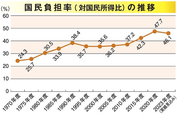 20%台で推移してきた国民負担率が30%を超えたのは1979年度だ。そして今から10年前の2013年度に40%を超え、現在に至っている。グラフのとおり、長期的に見ればこの割合は徐々に上昇してきている。