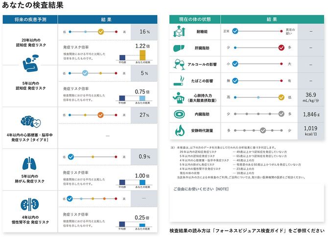 ●本検査は、健康保険の対象ではありません。医療機関の自由診療として実施されます。●本検査は、特定の年齢層の方のデータを対象として行われた分析結果に基づき判定します。●医師の判断によることなく、本検査の結果を、疾病の診断・治療・予防等に用いることはできません。●本検査は、その結果の正確性や、他の検査方法と同等の結果の提供を保証するものではありません。●将来の疾患予測に関する検査結果は、生涯にわたってのリスクを予測するものではありません。●コンシェルジュによる健康相談は、フォーネスライフからご利用者に直接ご提供するサービスです。これらは、ご利用者の生活習慣の改善、健康意識の向上をご支援するものであり、検査結果の改善や、疾病の診断、治療、予防等を目的とするものではありません。●本検査の結果に対する理解と行動は、個人の判断に委ねられます。