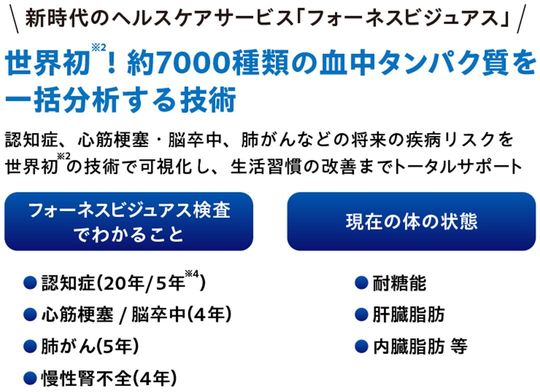 そこで当社は「早期発見よりも、もっと早く」のコンセプトの下、少量の血液検査で将来の疾病リスクを可視化できる世界初(※2)の技術を活用したサービスを開発しました。認知症、肺がん、心筋梗塞などの罹患リスクをデータで解析し、個人に合わせた生活習慣改善までサポートする「フォーネスビジュアス」を、2020年から医療機関の医師を通して提供を開始しています。