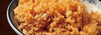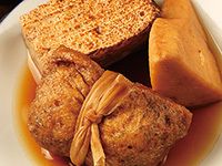 2 おでんと並んで名物の「茶飯」(150円)は、ご飯を生醤油と酒で炊いたもの。上にがんもどきを載せて、浸みだした汁とともにかき込むと絶品。牛肉、玉葱、しらたきを詰めた“フクロ”を載せれば即席牛丼に。フクロは2代目が大正時代に発案したオリジナル。