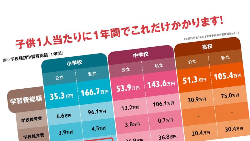文部科学省が公表している「令和3年度子供の学習費調査」からわかったのは、小学校から大学まで、すべて公立の学校だったとしても、16年間で1000万円を超える、ということだ。