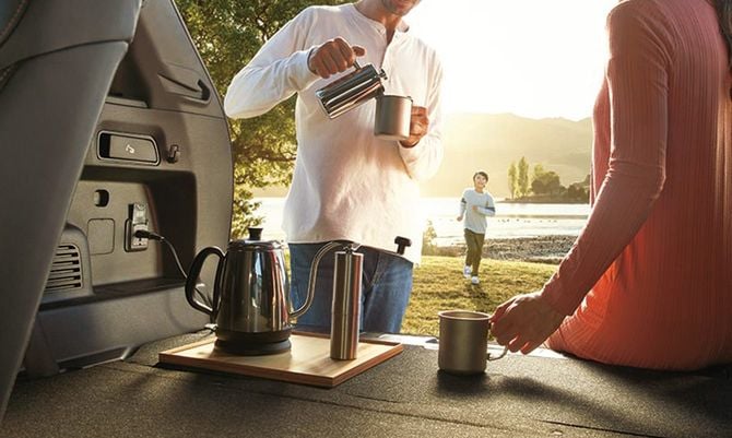 アウトランダーPHEVにはAC100Vコンセントが後部座席足元と荷室に1つずつ設置されている。2つのACコンセントは独立して利用でき、最大出力は2つ合わせて1500Wのため、アウトドアでコーヒーメーカーや炊飯器、ホットプレートなど、消費電力の大きい電化製品を使うこともできる。