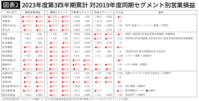 業績を牽引したのはどの部門なのか。いわゆる私鉄ビジネスモデルを構成する「運輸」「不動産」「流通」と、その他セグメントの第3四半期累計(4~12月)営業利益を、コロナの影響がない2019年度同期と比較すると、運輸セグメントがコロナ前を上回ったのは東急と小田急のみである。