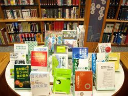 南相馬市立中央図書館にて。レファレンス(調べもの)棚の前に置かれた特設台。