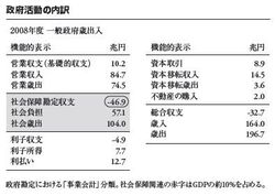 もう1つ大切なのは、有意義な分類をするということです。たとえば企業を分析するときには、事業=ビジネスライン別に見ます。事業別に並べてどこで利益を出しているか、どこで損を出しているかを見るのです。しかしながら、政府の場合はほとんどそういうことをやっていません。そこで、ここでは国・地方・社会保障基金を連結ベースで見て、日本政府の歳出・歳入をビジネスラインで分けてみました。表を見てください。
