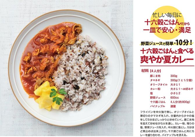 これまでにも、十六穀ごはんを使ったさまざまなレシピを考案している浜内さんが、野菜不足と夏の暑さ対策に効くメニューを教えてくれた。それが冒頭で記した特製カレーだ。十六穀ごはんとカレーは、とくに相性がいいという。水の代わりに市販の野菜ジュースを使って煮込むのがポイントだ。