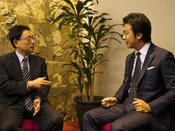 それぞれの視点から「これからの都市のあり方」を探る髙島宗一郎・福岡市長(右)と藻谷浩介氏。