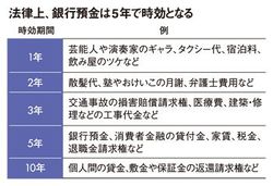 法的にいうと、銀行預金は預金者にとって債権、銀行にとって債務にあたる。債権などの財産権には消滅時効があり、一定期間、行使しなければ権利が消滅する。債権は10年間行使しなければ消滅し、債権と所有権以外の財産権は20年間行使しないと消滅する(民法第167条)。
