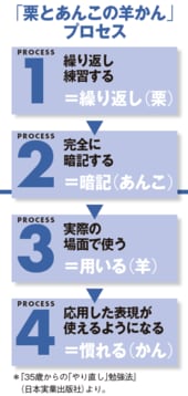 そういった人に座右の銘にしてもらうべく考えた言葉が、「栗とあんこの羊かん」プロセスだ。教材となる英文を「繰り返し、暗記して、用いて、慣れる」ということだが、略して「繰暗用慣」と言うと下手な故事成語みたいなので、もっと楽しいイメージを喚起させる「栗とあんこの羊かん」プロセスと名づけた。