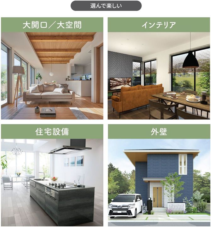 外壁は13パッケージ、内装材や建具などのインテリアは10パッケージから選べるので、家づくりの楽しみも十分に味わえる。大和ハウスのインテリアコーディネーターがさまざまな建材から選び抜き、バランス良く組み立てたコーディネートは、色合いや質感のバラエティーに富み、センスが良くて飽きがこない。住宅設備も、システムキッチン・洗面化粧ユニット・システムバスのそれぞれを、人気メーカー3社のラインアップから選んで組み合わせることが可能だ。