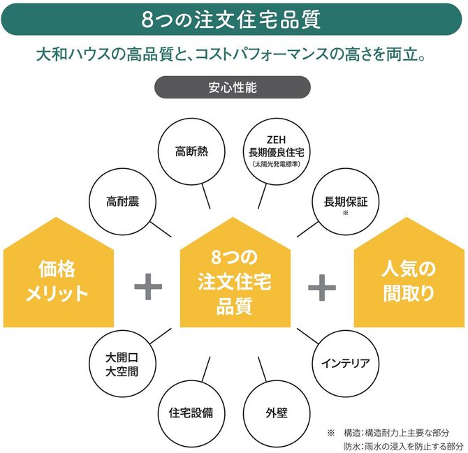 これまでに何万軒もの住宅を建ててきた大和ハウスの経験と英知をぎゅっと詰め込み、大和ハウスの高品質・長期保証も確保。価格以上の価値ある住まいが実現できる。