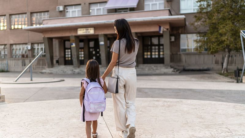 子どもと手をつないで学校に行く母親