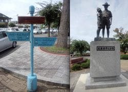 JR水沢江刺駅前の洪水標識(左)と後藤新平像(右)。