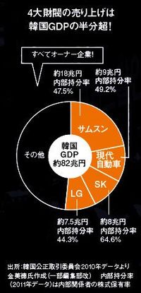 経営トップは、先陣を切ってこの精神を実行する。韓国企業の強さの特徴として、オーナー経営者による迅速な意思決定を挙げる声も多い。表の通り、韓国GDPの半分超を占める4大財閥のすべてがオーナー企業。さらに資産総額の上位10グループをみると、サラリーマン社長を輩出しているのは製鉄会社のポスコのみである。