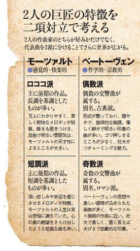 モーツァルトの場合、ケッヘル番号(K)480番あたりを境として、前期と後期とで曲調が変わる。前期の代表曲には、ピアノ協奏曲21番のような長調を基本とした美しいメロディの曲が多い。ロココ調といってもいい。後期は一転して短調を基本とし、暗く深刻なのが特徴だ。交響曲40番、クラリネット五重奏曲、絶筆の「レクイエム」といった、人生の深みを感じさせる楽曲が並ぶ。
