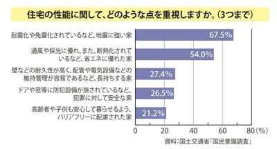 未曾有の被害をもたらした東日本大震災からまもなく2年。大震災は、これから住宅をもとうとする人に大きな意識変化をもたらした。国土交通省が2012年1月末~2月に実施した国民意識調査で、震災後に重視する住宅性能について尋ねたところ、「耐震化や免震化等、地震に強い家」が最も多く67.5%。次いで「省エネに優れた家」54.0%という結果となった。地震に備えたい気持ちは当然のことだろう。