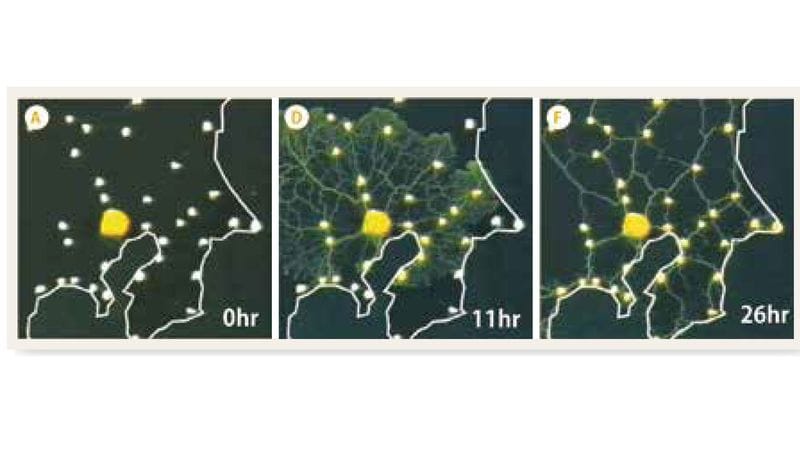 4時間おくと、次第に迷路のスタートとゴールを何とか管で結ぶ形に変身した。さらに時間が過ぎると、行き止まりの道を管が通らないように変身し、いちばん短い距離でスタートとゴールを結んだ。