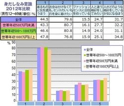 男性が身だしなみやファッションに対してどんな意識をもっているか。年収別に棒グラフにしてみたが、ほぼ差はない。「お金はかけなくても、センスのいいものを身につけたい」と答えた人は年収差なく全体のほぼ80%。と、思いつつも「ファッションセンスに自信をもっている」と答えた人は15%前後。ここを細かく見ると、年収500万円以下のマル庶の男性たちが16.1%と一番高く、マル中、マル金を上回ったのが面白い。「センスはお金では買えない」という自負の表れであろうか。