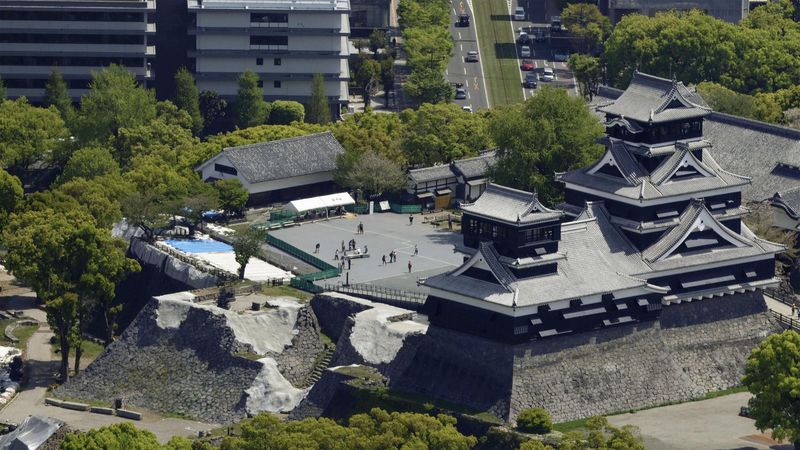 国の重要文化財に指定されていた13棟の建造物はすべてが被災し、北東の石垣上に建っていた東十八間櫓と北十八間櫓は全壊。現在の本丸から800メートルほど離れた「古城」に加藤清正が築いた初代天守を移築したといわれる3重5階の宇土櫓は、破損しつつも倒壊は免れたが、それに続く多門櫓と二重櫓は倒壊した。
