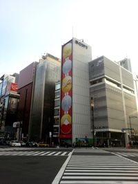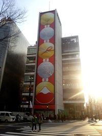 ビルの前を通る晴海通りを反対側に渡り、更に外堀通りを有楽町側に渡って鑑賞する。ちょうど数寄屋橋交差点の交番前辺りが、一番の鑑賞スポットかもしれない。その際立った存在感が、道行く人々の目を引く。