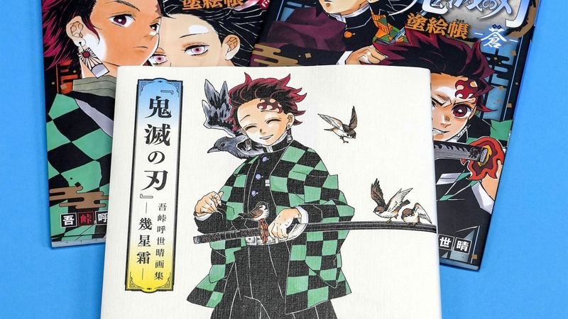 「『鬼滅の刃』吾峠呼世晴画集―幾星霜―」(手前)と、2冊の塗り絵帳=2021年5月