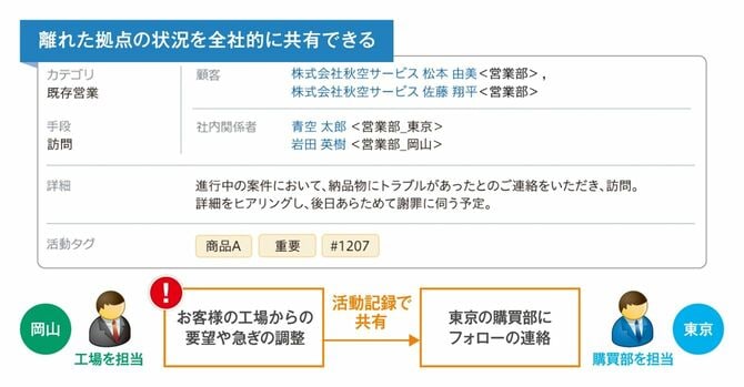 また、当社のお客様には全国展開している企業が多く、地域によって営業担当が異なるケースも少なくありません。そのため、全国各地の営業担当が「SKYPCE」を通じて営業活動の進捗を共有し、お互いに連携することで効率的に案件を進められるようにしています。例えば、東京の購買部とやりとりをする営業担当と、地方の工場を訪問する営業担当がそれぞれ「活動記録」を入力しておけば、離れている拠点の状況も全社的に共有することができます。地方(納入先)のお客様から出た要望や急ぎの調整を、東京の営業担当が素早く把握してフォローに回るなど、トラブルの回避や手厚いサポート体制の実現に役立てています。