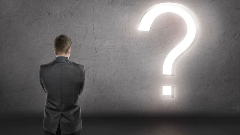 立っているビジネスマンの前のコンクリートの壁に鮮やかなクエスチョンマーク
