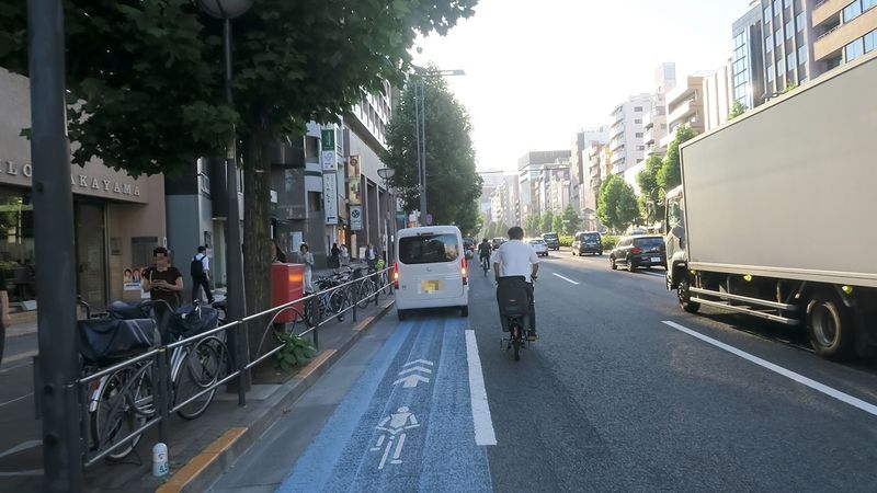 もちろん車道左端は自転車にとっての走行スペースである。ここにEVがある限り自転車は車道側に膨らんで走らざるを得ない。