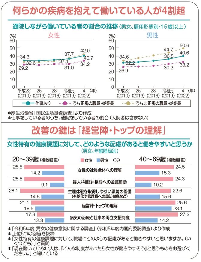 健康課題に関するこれらの情報から読み解けるのは、どのような組織にも「何らかの疾病を抱えながら働いている従業員が一定の割合で存在し得る」という事実である。男女でさまざまな違いはありながらも、通院しながら働いている者の割合は女性40.7%、男性40.6%と同程度に上るとされ(厚生労働省「国民生活基礎調査」より)、しかも年々上昇しているという。職場での健康支援を進める上では、健診の数値が上がったり下がったりといった側面だけにとらわれず、疾病を抱えている人がいるという前提に立って「どうサポートすれば組織としてより良いパフォーマンスを発揮できるのか」「男女の違いや疾病の有無を踏まえていかに互いの理解を深めていくか」を考え、対策を立てることが重要だろう。
