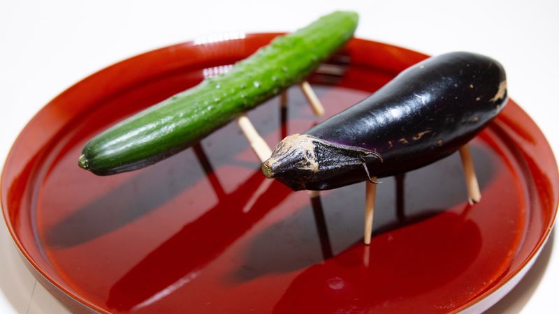 お盆には、精霊を迎えるにあたって盆棚を飾る(盆入りの13日頃)。キュウリとナスで作った馬と牛を飾るのは、「馬(キュウリ)に乗って早くこの世に戻ってきて欲しいが、あの世に戻る際には名残惜しいので牛(ナス)に乗ってゆっくりと戻っていって」という俗説があるからだ。