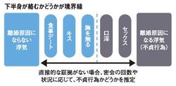 不貞行為は、一般的には男女間の性交やその類似行為のことを指す。性交とはセックスのことであり、ほかに解釈の余地はない。問題は類似行為のほうだ。現在の判例上は、セックスのみを不貞行為としている。しかしながら、キスしたり胸を触ったりする程度なら類似行為とまではいえないが、オーラルセックスや射精を伴う行為はセックスの類似行為とみなされ、「婚姻を継続し難い重大な事由」(民法770条1項5号)に該当する可能性がある。