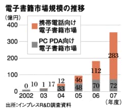 ケータイや専用端末でコミックや小説を読む電子書籍が活気づいている。IT技術関連メディア事業を手がけるインプレスR&Dが、通信事業者や出版社など47社に対して行ったヒアリング調査によると、2007年度の市場規模は355億円で、前年度に比べ約2倍に増えた。なかでもケータイ向け電子書籍は283億円と約8割を占め、伸び方も全体を上まわる2.5倍の勢いを示した。