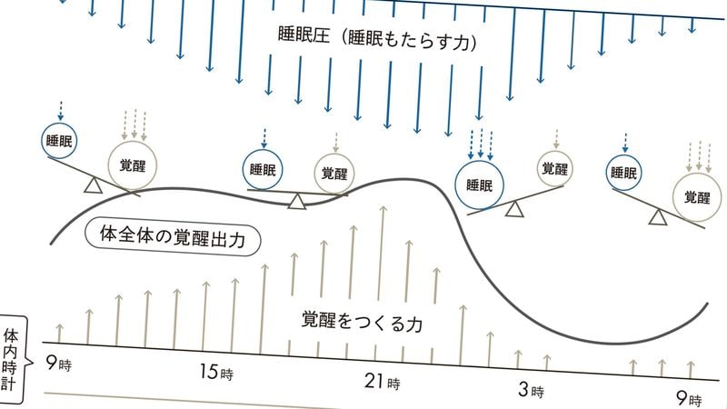 起きている時間が長くなるにつれて睡眠圧は増えていきますが、体内時計は「起きている状態をつくる力」を高くして睡眠圧に対抗しているのです。