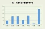 ところで、何歳を扱う書籍が最も多いのでしょうか。刊行は、主に5の倍数の年齢に集中しているので、それらを整理したものが図3です。25歳、30歳、40歳がそれぞれ10冊を超えているのですが、目を引くのは50歳です。女性の生き方のターニングポイントになるのは50歳ということなのかもしれません。これはこれで非常に興味深いのですが、男性向け「年代本」で扱ったのは40代までなので、今回は「50歳論」を除外することにします。また、5の倍数以外で刊行数の多かった年齢は、29歳が7冊、24歳と28歳がともに3冊でした。「年齢本」一般がそうですが、20代については各年齢がそれぞれターニングポイントとされているようです。