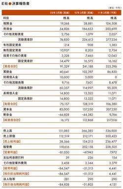 では、ここに挙げたE社は、決算書から見て投資に値するだろうか。ざっと見たところ、現預金は着実に増えている。09年の実績が1926万円、10年実績が3888万円だが、11年の予測は約3倍の1億円に達している。売上高も09年実績が1億5108万円、10年実績が3億6638万円で、11年予測が5億3690万円と着実に伸びている。税引後当期純利益は09年、10年の実績は赤字だが、11年3月期の予測では415万円の黒字転換が見込まれる。