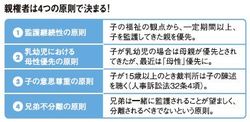 親権者は、「母性優先の原則」(乳幼児ほど母親を優先)、「子の意思尊重の原則」(子が15歳以上の場合は法廷で陳述)などのいくつかの原則に沿って親権者を決める。なかでも裁判所が重視しているのは「監護(子の管理・保護)継続性の原則」だ。