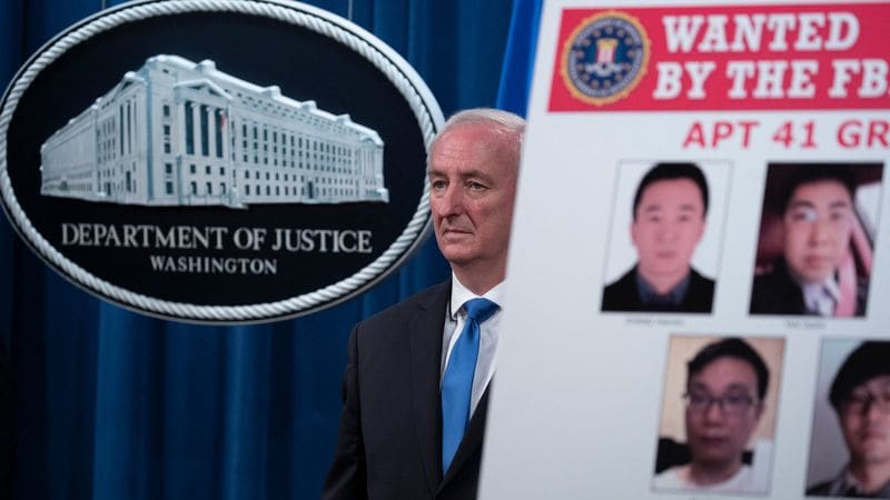 ジェフリー・A・ローゼン司法副長官は2020年9月16日、ワシントンD.C.の司法省で、「APT 41」と呼ばれる中国政府や人民解放軍の支援を受けたサイバー攻撃に関連する告発と逮捕について、FBIのデビッド・ボウディッチ副長官の話を聞いた。