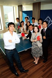 広告営業本部の隣にある共有スペースにて。卓球台、ビリヤード台、サッカーゲーム機が並ぶ。この日も小川さん(左)の「ちょっとやるか!」の声でラリーが始まった。