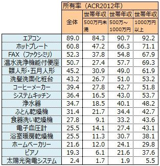 反面、エアコンのようなものでは所得層に関わりなく、大半の家庭に普及していることがわかる。