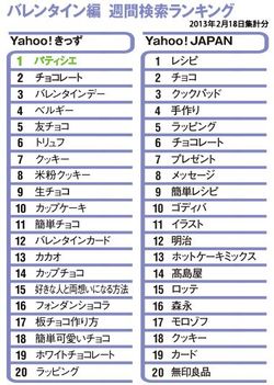 Yahoo! きっず」と「Yahoo! JAPAN」のバレンタイン編週間検索ランキング(2013年2月18日集計分)。