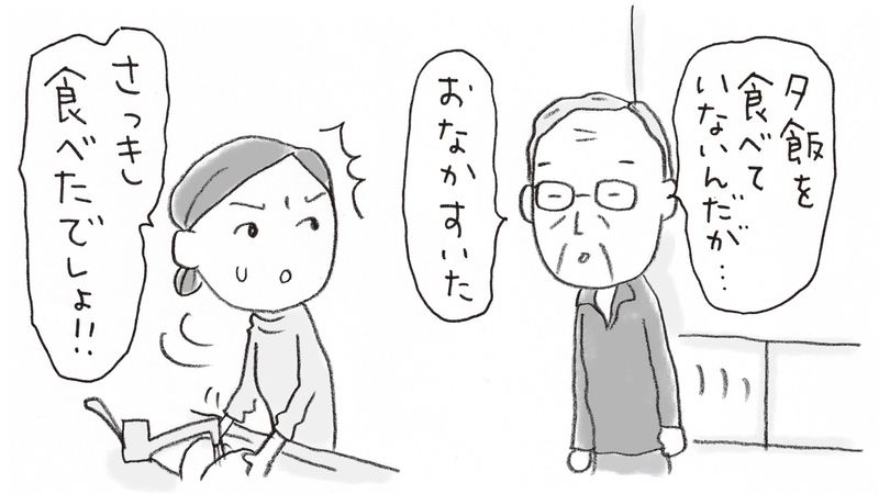 A子さんと同居している義父は、年々もの忘れがひどくなり、最近では1分前に話したことも忘れてしまいます。同じことを何回も質問するので、「さっき教えたじゃない」と言うと「聞いてない」と言います。あまりに何度も聞くので壁に書いて貼っておいても見てはくれません。A子さんが特に困っているのは、「夕飯を食べていない」と言われることです。
