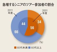 シニアの家計支出を調べると、上位項目に必ず入るのが旅行だ。時間的、金銭的なゆとりが多いシニアは、旅行業界の大得意客なのである。なかでも、8年ほど前からシニアをターゲットにした戦略を打ち出し、注目されている旅行会社がクラブツーリズム。2011年度の売上高は過去最高の約1390億円で、2012年度についても2ケタ近い伸びが見込まれている。11年度のツアー参加者(実数)のうち、60代以上が66%と3分の2を占める。
