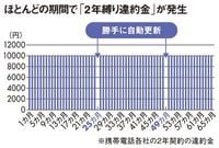 2年縛りとは、携帯電話の基本料金や通話料金を割り引く代わりに、2年間ごとの契約継続を求めるもの。NTTドコモをはじめ、au(KDDI)、ソフトバンクモバイル(SBM)など、大手キャリアはどこもよく似た2年縛りの契約を事実上の標準プランとし、各キャリアの新規加入者の8~9割が、こうした2年縛りのプランに加入しているという。