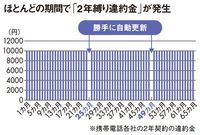 しかし、こうしたお得プランの裏側には、キャリア側がユーザーを囲い込むために仕組んだ策略がある。契約期間中に解約や他キャリアへMNPで乗り換えをすると、各社横並びで設定された9975円の「解約金」を支払う必要があるのだ。解約金がかからないのは、契約から2年満了時のわずか1~2カ月間だけ。この期間がすぎると自動的に契約が2年間延長となってしまう。