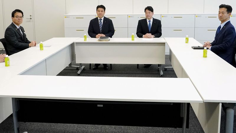 政策協議に臨む国民民主党の浜口政調会長(左から2人目)、自民党の小野寺政調会長(同4人目)、公明党の岡本政調会長(同5人目)ら=2025年2月4日午後、国会