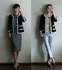同じジャケットでの通勤コーディネートの楽しみ方。大きな朝礼や打ち合わせなどがある時はワンピースと合わせて、書類整理がメインの日はパンツでカジュアルに。