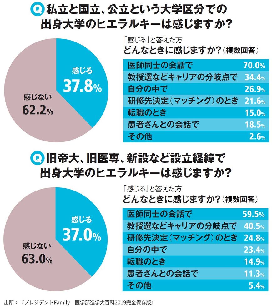 母校愛あふれる若手医師だが、出身が「国公立大か私大か」「旧帝大か新設医大か」といった区分によってヒエラルキー(差別)を感じたことがあるかと尋ねると4割近くが「感じる」と答えた。