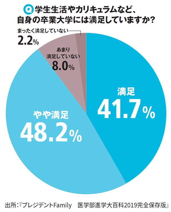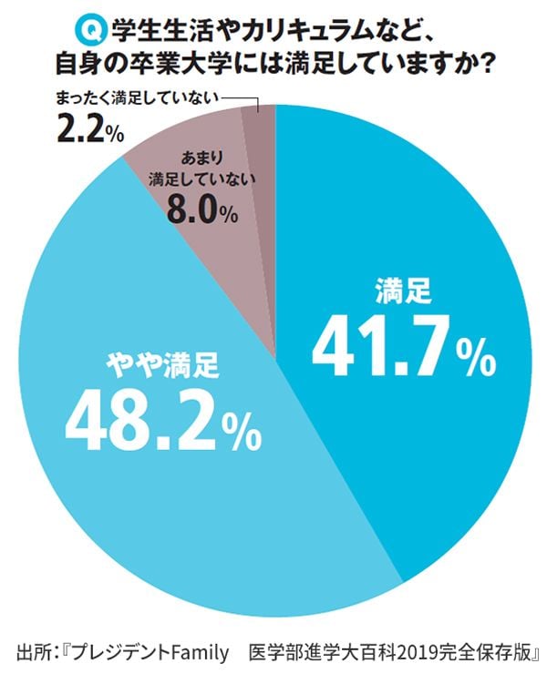 その結果、出身大学の医学部について「満足しているか」とたずねたところ、卒業した大学に「満足している」「やや満足」と答えた医師は89.9%と高水準だった。